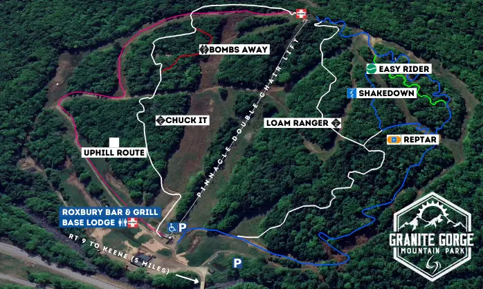 Intermediate trails. Great for building skills, flow riding, and exploring more features. The main line of the trail is beginner-friendly with plenty of space to avoid features. As a designated freeride trail, it features both natural and constructed elements. This terrain includes, but is not limited to, jumps, ride-on features, berms, and other natural or constructed features.